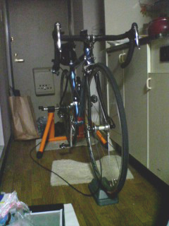ちょっと見にくいですが、aquaの後ろに見える明るいオレンジのモノがミノウラのローラー台。最初の組み立てが意外と難しいものの、なんとか完成させて早速セッティングしてちょっと漕いでみる。