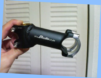 これが購入したステム。普通のモノより角度があるのが分かるでしょうか? 実は私が頼んだものは品切れになっており、来年3月まで入荷は無いという事でコレは替わりとして用意してもらったもの。予定していたものよりグレードが低く、グレードアップも兼ねて注文していたのでちょっと残念。まぁ気にいらなければ来年3月にまた注文するとしましょう。