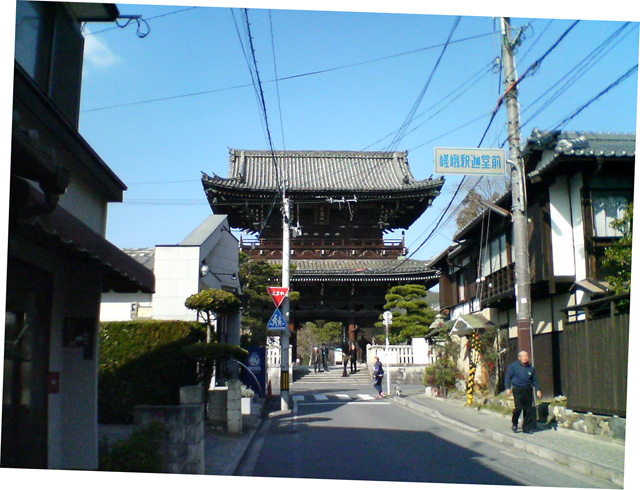 渡月橋を渡り、とりあえずまっすぐ進む。実は渡月橋を渡ったのは今日がはじめて。その先はいかにも古都京都の町並みが迎えてくれる。ずっと行って突き当たりに立派な門構えのお寺がある。正式名称は右上の看板に書いてあるが、別名を清涼寺というらしい。なんて無闇なまでに清々しい名前w
