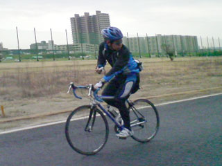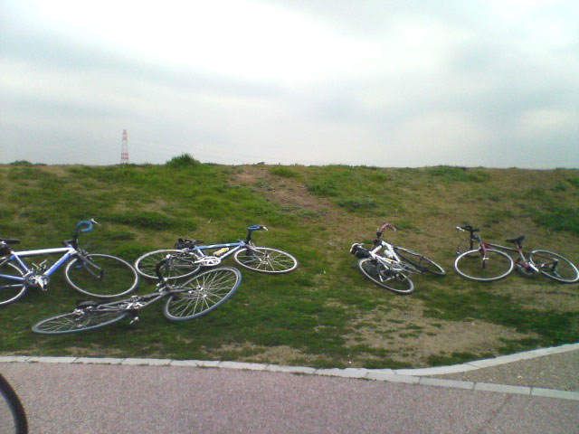あまりに早く到着してしまったので都古さん達との待ち合わせ場所(と思われる場所)まで行ってみる。行ったが最後、すぐそこなのに戻るのも面倒な気がしたのでメールで関西医大裏にいる旨をGonさんに伝える・・・が、走行中で気づかなかったらしく、約束の時間に電話してやっと連絡が着く。しばらく待ってGonさんが到着。まだ時間があるのでマッタリと待つ。そういえばGonさんのロードレーサーの実車を見たのは初めて。さすがにちょっと古い型のモノですが、レトロな感じのデュラエースもいい味しています。そうこうするうちに都古さん達も到着。