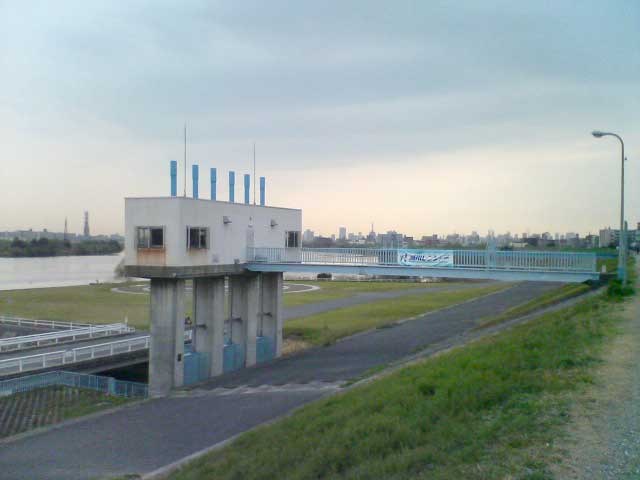 この建物も目印としては特徴的ですね。下を走っているときにこれが見えたら、この先では階段でしか土手には上がれません。この建物の反対側(写真右側)に神崎川へ入るための土手を降りる道があります。すぐ信号になっていますので、渡ってまっすぐいけば50mと行かずに神崎川への入り口があります。入っておよそ200~300mくらいの区間に水草が茂っており、そこが我らがアイドル(w)、ヌーちゃんがいる辺りです。