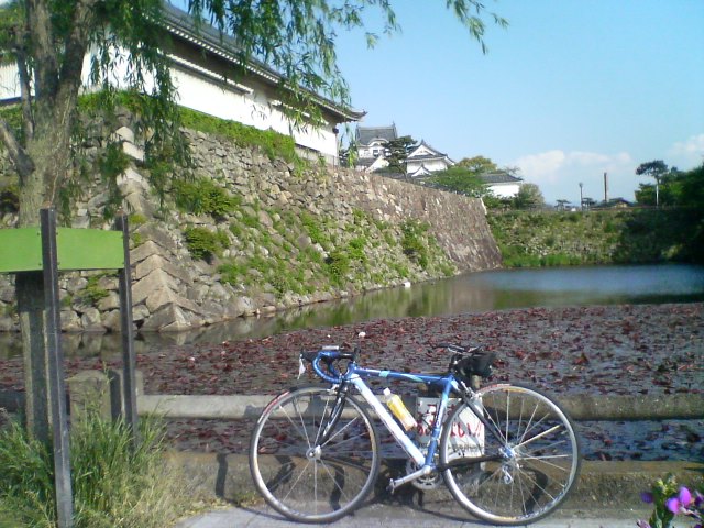 岸和田城前(というか後ろ)にて。ロードレーサーの上にちっちゃく見えるのが本丸w