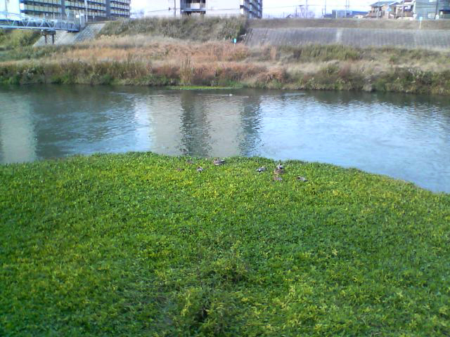 神崎川まで戻ると渡り鳥でしょうか? かなりの数が水の上でのんびりしています。これは写真を撮らねばとケータイを取り出し、ふと画面右下にある「機能」の文字に目が止まる。試しに見てみると・・・なんだ、結構大きなサイズの写真がとれるじゃないか。ロードバイク以上にド素人ですねw というわけで初の大きめの一枚をパシャリ。
